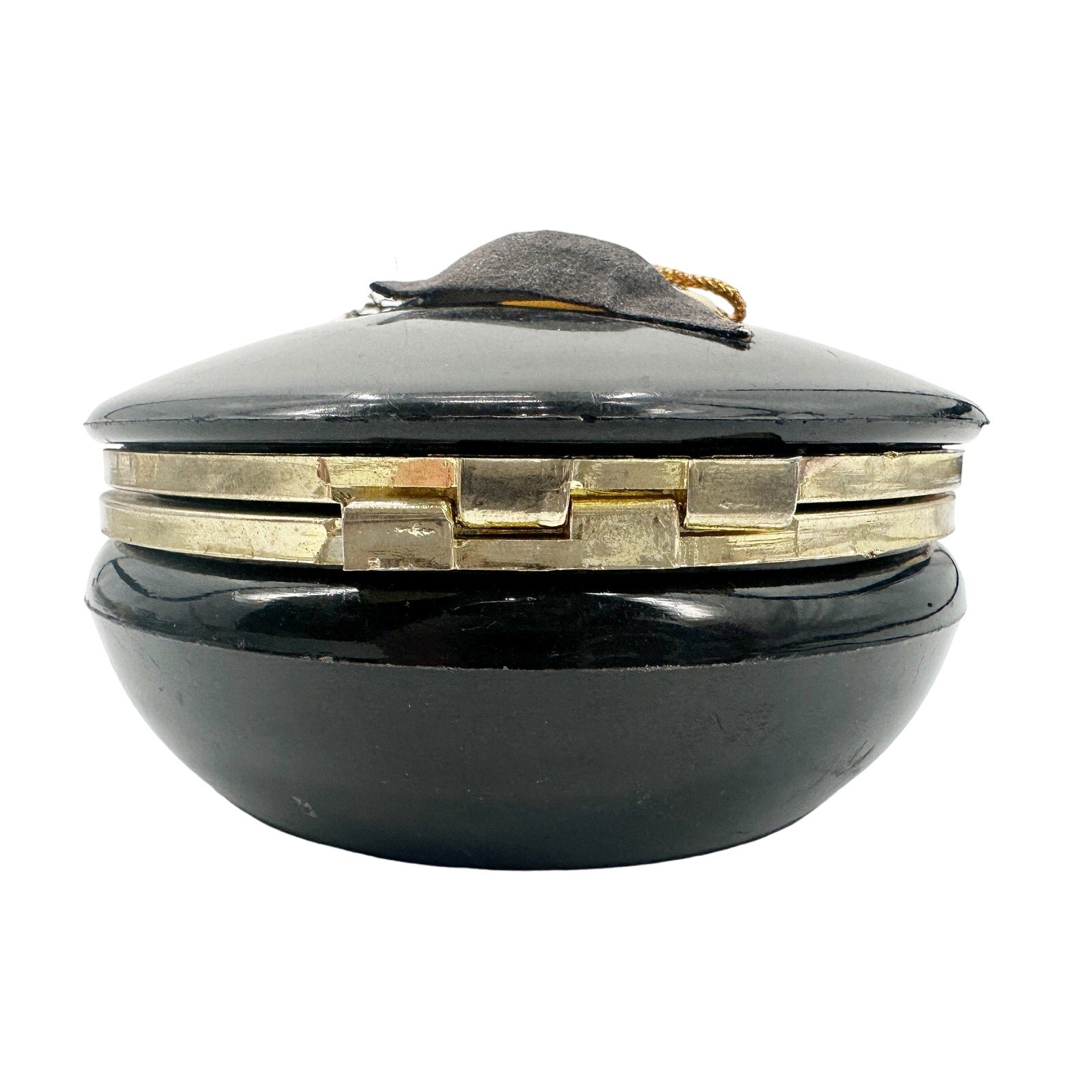 vintage circular-shaped hinged Trinket Box black jewelry container art deco face