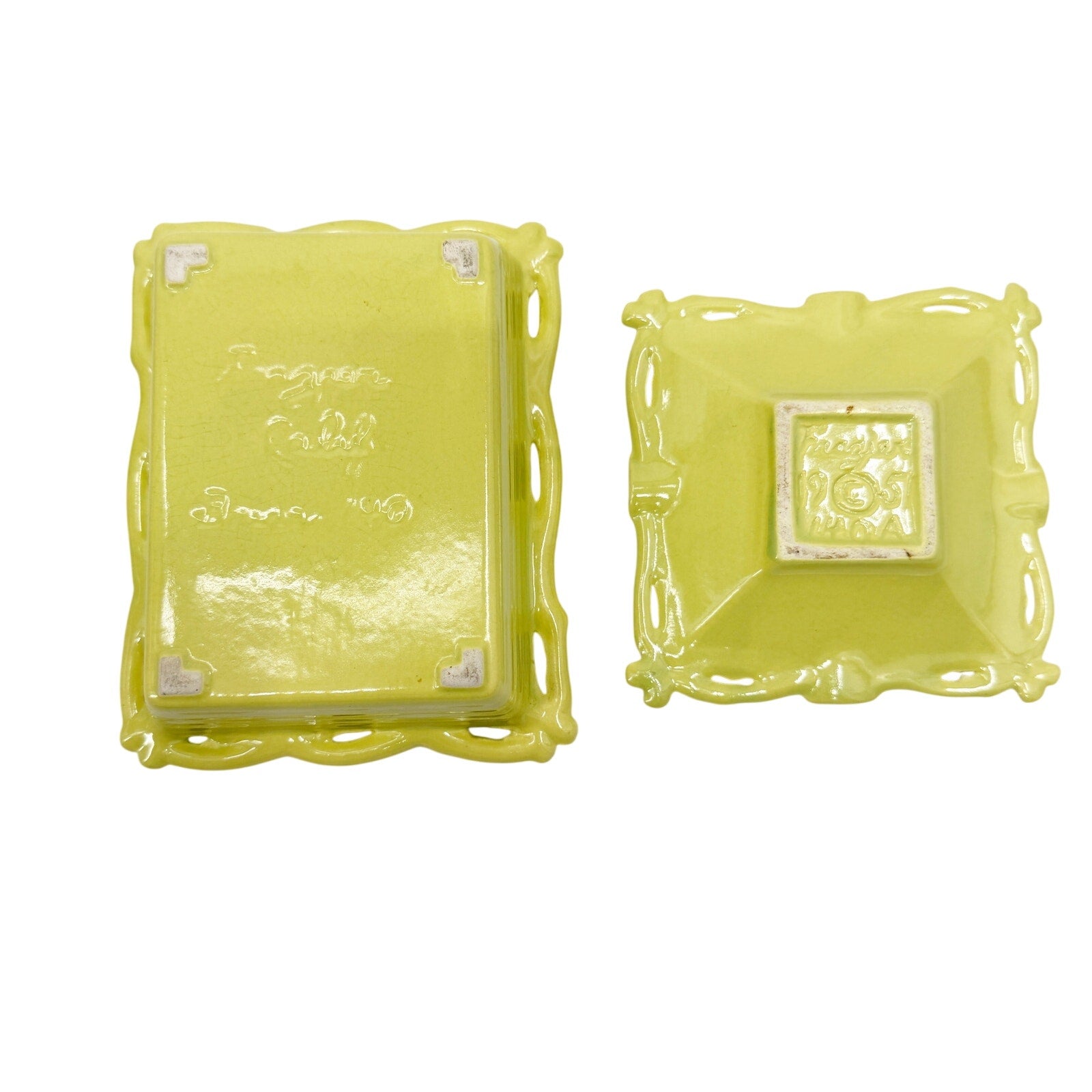 vintage yellow pink & green Frazier Cigarette Box and Ashtray California pottery